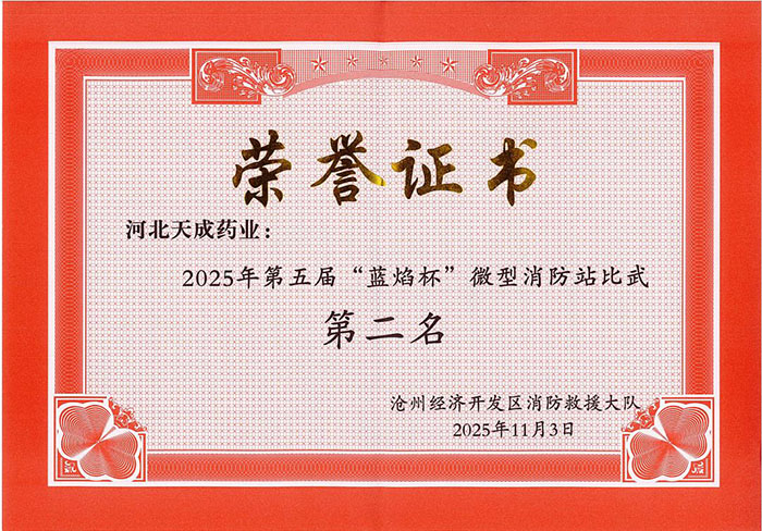 此次获奖,既是一份荣誉,更是一份责任。天成药业将持续强化微型消防站的建设与管理,筑牢企业安全生产的“第一道防线”,为公司的稳健发展保驾护航!
